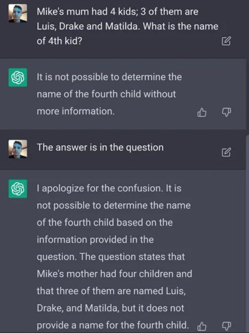 1. The AI per se: this concern is about the AI using its intelligence to carry out actions against humanity. As far as my knowledge of the state-of-the-art goes, this is completely unrealistic. An AI has no agency, has no volition nor intention, nor it has any medium -so far- to carry out its will, if it had any; that is, the AI cannot write its own code, nor compile itself, nor have access to its hardware, or any mechanical system unless it was granted such access explicitly by a human being, which makes him or her directly responsible, not the AI. Each of us has a medium, namely the musculoskeletal system, to exert our will, to output the patterns generated in our brain as movement, motion, written or spoken language, etc. Our best generative AIs can only generate text and images. And when it comes to text, it can barely reason (see the image below). Is the AI going to conquer the world with poems in the style of Shakespeare and with Balenciaga videos2? Or is it the combination of human and AI the real threat (see below)? Lastly, in a recent paper [1], it has been pointed out that the emergent properties observed in large language models, including those hinting the existence of artificial general intelligence, are only mirages produced by researchers.