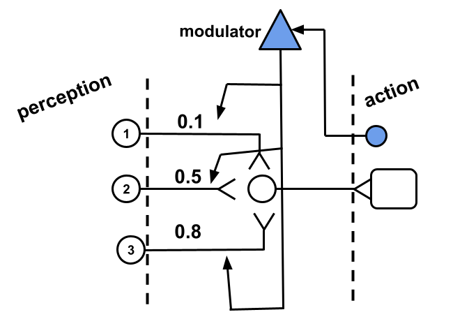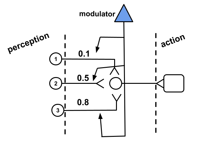 How would the modulator decide when to modulate? The modulator must have a input of some kind that triggers its action over the synapses of other neurons. In the best scenario, the activation of the modulator follows a rating that the system gives to an action recently performed. In other words, the system would possess some way to evaluate the effects of an action recently performed and modulate responsible synapses accordingly. Our modulator, therefore, would implement some perception mechanism close to the effector of the system, that is, close to its output as in Fig. 2.