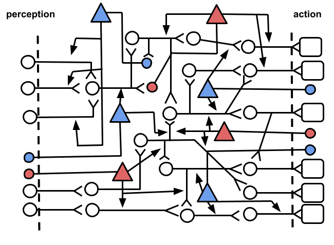 A modulator’s input component could also be located in other places within the system. For instance, it could be receiving activity from interneurons as shown in Fig. 3, where we have also differentiated between modulators that increase the influence of their targeted synapses (blue) and modulators that decrease them (red). The former could be read as the effect of an action that produces pleasure, whereas the latter could be interpreted as the effect of an action that produces pain1.