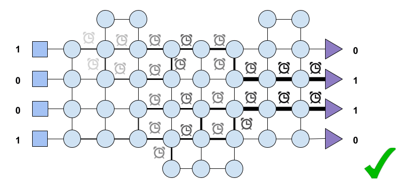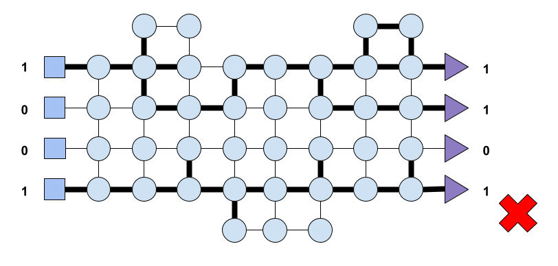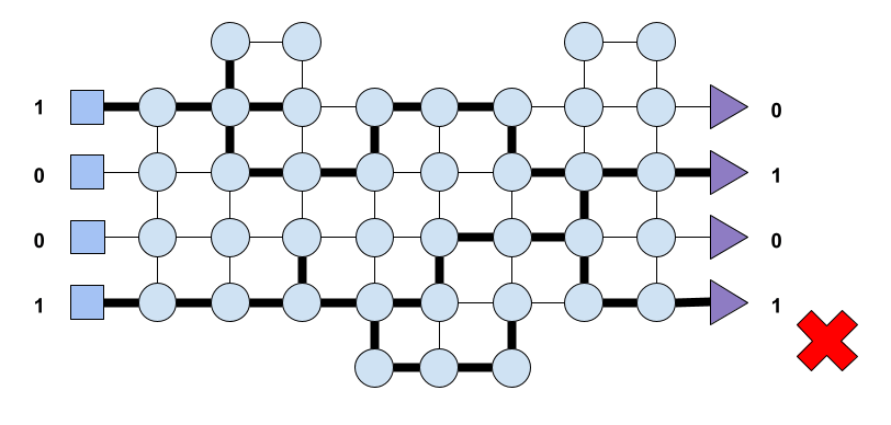 that is, input (1, 0, 0, 1), only that this time because of the status of each node at the time of input arrival the system yields the output (1, 1, 0, 1). In Fig. 6 we show the path that resulted in such output. Once again, the system must update the inter-node connectivity accordingly and penalise such connections that led to the undesired output. How does the system achieves that is not something we care for now. It could be that the system makes use of modulators as explained above or some type of Hebbian learning.